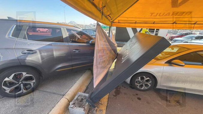 Chihuahua.- Un aparatoso choque registrado en el periférico ocasionó un susto entre los empleados de una agencia de autos, luego de que una camioneta Chirey se proyectara contra la infraestructura del lugar y derribara un anuncio que terminó cayendo sobre un automóvil en exhibición.