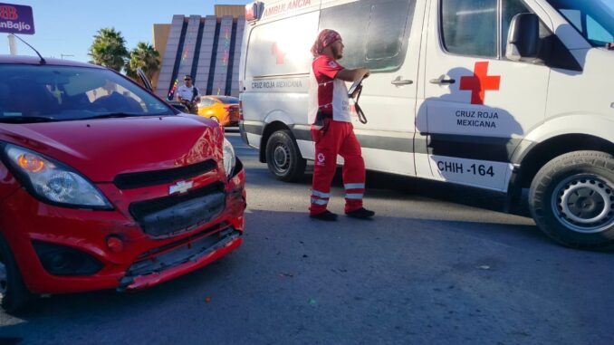 MUn percance vial se registró frente al Teatro de la Ciudad, en el cruce de la avenida Agricultura con la avenida Río Conchos, en el sector oriente de Delicias, donde se vieron involucrados un automóvil Chevrolet tipo Spark en color rojo, en el que viajaba una familia, y una camioneta de entrega de la marca Fiat, tipo cerrada, por lo que al lugar arribaron paramédicos de la Cruz Roja Mexicana para brindar atención a los ocupantes del vehículo particular, quienes tras una valoración determinaron que no era necesario su traslado al centro médico.