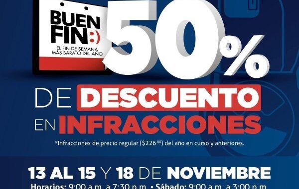 El Consejo Municipal de Estacionómetros invita a la ciudadanía a aprovechar el 50% de descuento en infracciones como parte de las acciones especiales del Buen Fin, conocido como el fin de semana más barato del año. Esta medida aplica para multas con precio regular de $226 pesos, tanto del año en curso como de años anteriores, ofreciendo una oportunidad para que los automovilistas se pongan al corriente con sus adeudos.