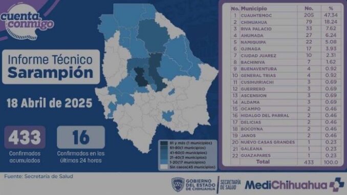 Asimismo, señaló que los casos de sarampión están distribuidos en Cuauhtémoc con 205, Chihuahua 79, Riva Palacio 33, Ahumada 27, Namiquipa 22, Ojinaga 17, Juárez 10, Bachiniva 7, Buenaventura 4, General Trias 4, Cusihuiriachi 3, Guerrero 3, Aldama 3, Ascencion 3, Parral 2, Ocampo 2, Delicias 2, Bocoyna 2, Janos 2, Nuevo Casas Grandes 1, Galeana 1 y Guazapares 1.