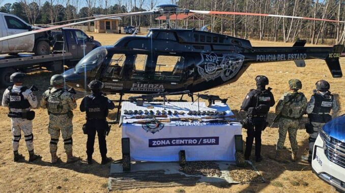 Guachochi.- Elementos del Ejército, Guardia Nacional y policías estatales llevaron a cabo el aseguramiento de un arsenal, así como de vehículos presuntamente utilizados por el crimen organizado, luego de repeler una agresión armada por parte de civiles.