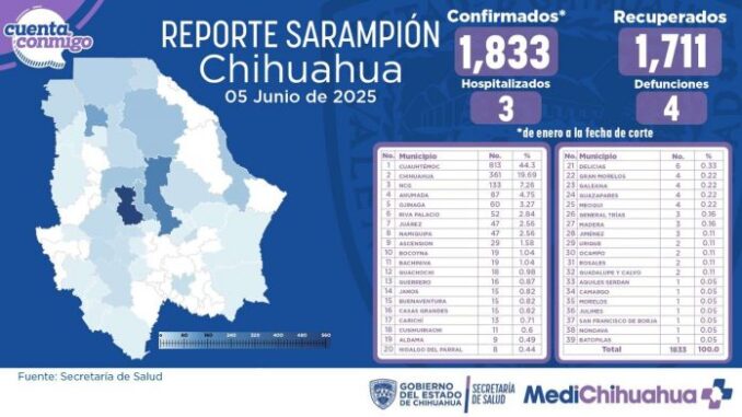 Además, se señaló que los casos de sarampión están distribuidos de la siguiente manera: Cuauhtémoc con 813, Chihuahua 361, Nuevo Casas Grandes 133, Ahumada 87, Ojinaga 60, Riva Palacio 52, Namiquipa 47, Ciudad Juárez 47, Ascensión 29, Bachíniva 19, Bocoyna 19, Guachochi 18, Guerrero 16, Janos 15, Buenaventura 15, Casas Grandes 15, Carichí 13, Cusihuiriachi 11, Aldama 9, Parral 8, Delicias 6, Gran Morelos 4, Guazapares 4, Galeana 4, General Trías 3, Meoqui 3, Madera 3, Jiménez 2, Urique 2, Ocampo 2, Rosales 2, Guadalupe y Calvo 2, Aquiles Serdán 1, Camargo 1, Morelos 1, Julimes 1, San Francisco de Borja 1, Nonoava 1, Batopilas 1.