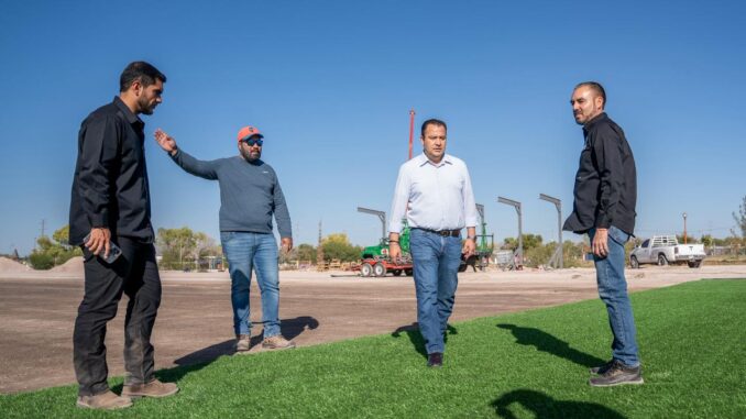 La construcción de la nueva pista de atletismo y cancha de fútbol con pasto sintético en Delicias avanza de acuerdo a lo establecido. El presidente municipal Jesús Valenciano García supervisó los avances en la instalación de las gradas y la estructura metálica del nuevo complejo deportivo que contará con una pista de atletismo y una cancha de fútbol con pasto sintético.