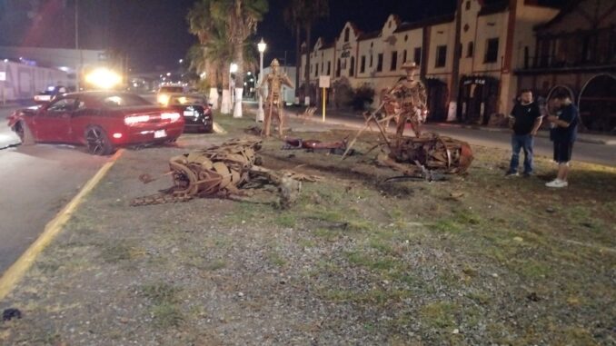 Un aparatoso accidente se registró durante las primeras horas de este sábado, cuando un conductor, de manera imprudente se impactó contra la escultura metálica ubicada en el camellón central frente al Hotel del Norte, causando daños materiales de consideración tanto en el vehículo como en la estructura ornamental.