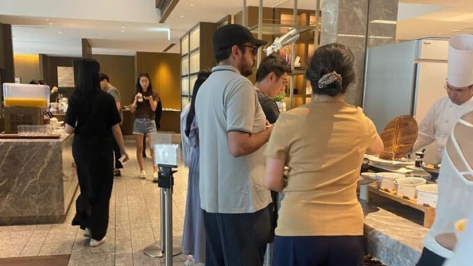 En las imágenes se aprecia al secretario de Organización de Morena desayunando en un bufet del hotel Okura Tokyo, un reconocido cinco estrellas de lujo.