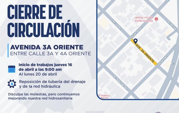 La Junta Municipal de Agua y Saneamiento de Delicias informó sobre el cierre temporal a la circulación en la avenida 3a Oriente, en el tramo comprendido entre calle 3a y 4a Oriente, debido a trabajos de reposición de tubería del drenaje y de la red hidráulica.