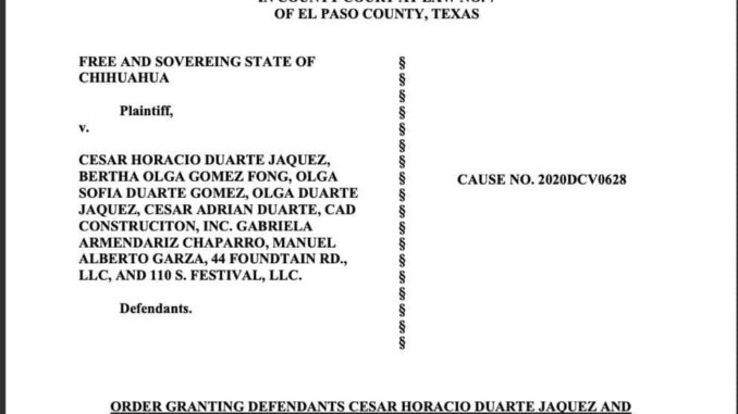 Chihuahua.- Abogados del ex gobernador César Duarte informaron que una Corte del Estado de Texas, desestimó este martes la denuncia presentada por el exgobernador de Javier Corral Jurado -quien firmó como ciudadano estadounidense- y por el propio Gobierno del Estado de Chihuahua en contra de César Duarte Jáquez. En dicha denuncia se le acusaba de operaciones con recursos de procedencia ilícita, asociación delictuosa, lavado de dinero y desvío de fondos públicos para adquirir más de 50 propiedades en Estados Unidos, supuestamente compradas con recursos destinados a la compra de medicamentos para cáncer infantil.