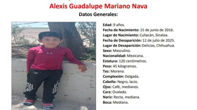 La Fiscalía General del Estado solicita el apoyo de la ciudadanía para localizar a Alexis Guadalupe Mariano Nava, un menor de 9 años de edad que desapareció el pasado 12 de julio de 2025 en la ciudad de Delicias, Chihuahua.