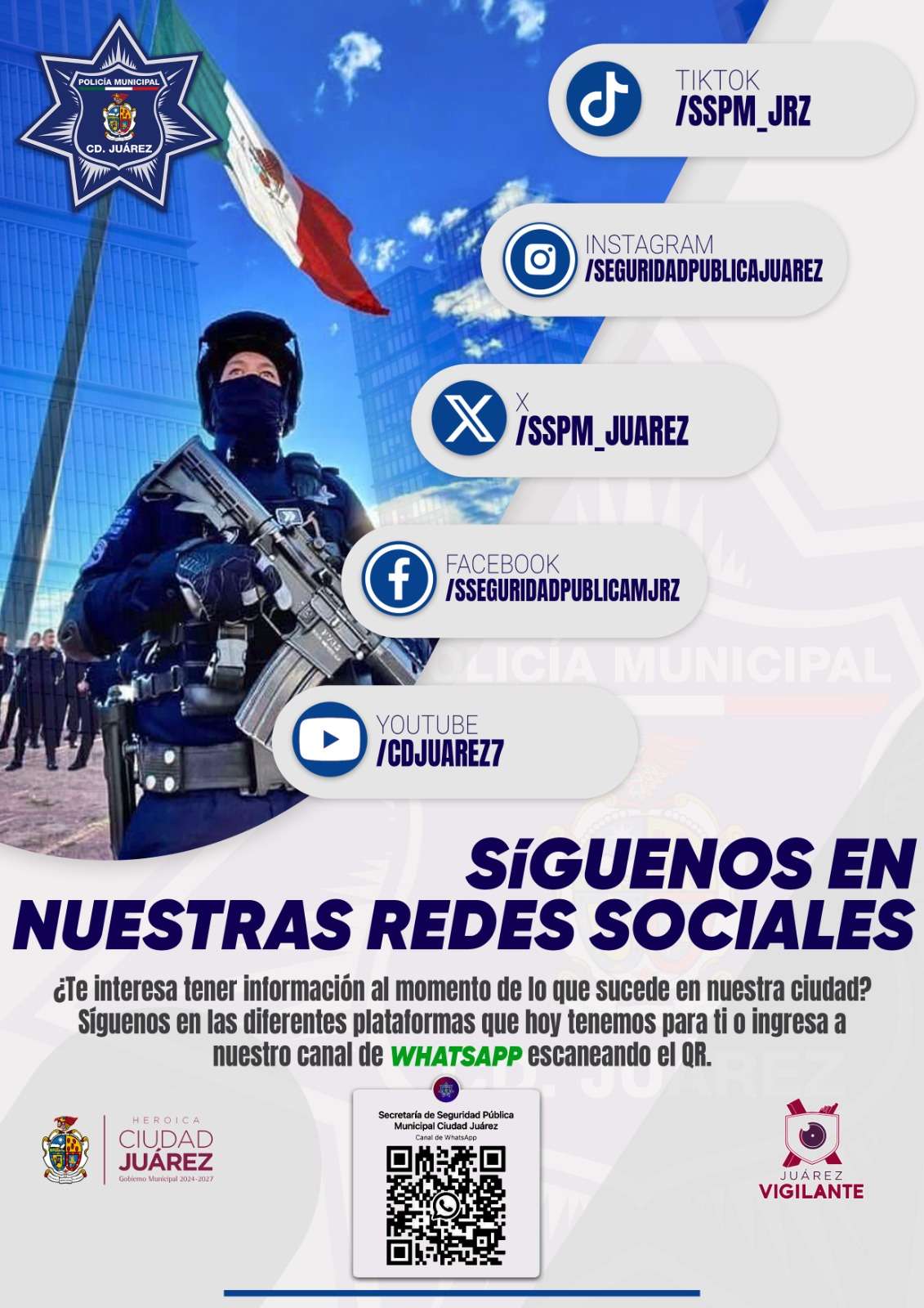 Ciudad Juárez.- La Secretaría de Seguridad Pública Municipal alerta a la ciudadanía a no hacer caso de mensajes que tratan de infundir miedo y caos en la ciudadanía, y brinda los siguientes consejos:
