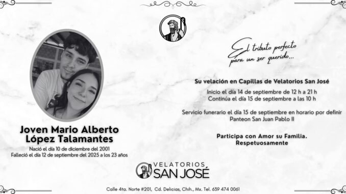 De acuerdo con la información difundida, la velación se lleva a cabo en el Velatorio San José, ubicado en calle Cuarta Norte número 101 de Delicias, Chihuahua, con un horario de 12:00 a 21:00 horas, permitiendo que allegados y conocidos se acerquen a despedirse y acompañar a sus seres queridos en este difícil momento.