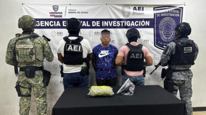 Elementos de la Agencia Estatal de Investigación adscritos a la Fiscalía de Distrito Zona Norte, en colaboración con el Ejército Mexicano y la Guardia Nacional, detuvieron a un masculino identificado como Jaime Rosendo J. V., por delitos contra la salud y posesión ilegal de arma de fuego.