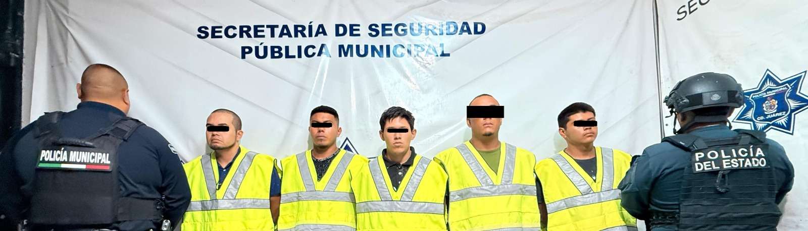 Ciudad Juárez.- Elementos de la Secretaría de Seguridad Pública Municipal adscritos a la estación de policía del Distrito Sur y de la Policía del Estado arrestaron a Cristian Antonio S. C., Eduardo Daniel H. M., Alejandro N. R., Luis Fernando J. V. y Luis Alfredo A. C., por su presunta responsabilidad en la comisión del delito de homicidio en grado de tentativa y delitos contra la ley federal de armas de fuego y explosivos, mismos que serán investigados por varios eventos de alto impacto ocurridos en la ciudad.