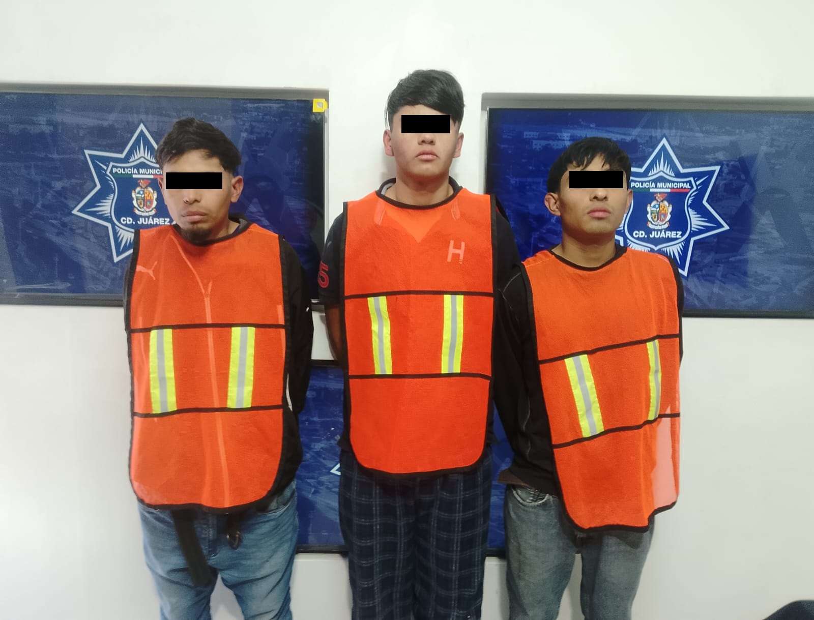 Ciudad Juárez.- Elementos de la Secretaría de Seguridad Pública Municipal, adscritos a la Estación de Policía del Distrito Riveras, arrestaron a Gustavo Armando R. H., Alejandro H. G. y Oscar Yahir H. J., por su presunta responsabilidad en la comisión del delito de robo a comercio con violencia.