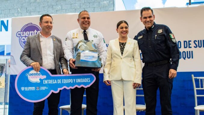 “Sabemos lo que cuesta un uniforme, unas botas tácticas, comprar un vehículo, equiparlo y hoy recibimos este equipamiento de manos del Secretario y por instrucciones de nuestra gobernadora. Es un orgullo poder recibir al Secretario y es una muestra de respaldo hacia el municipio el poder recibir a los alcaldes, pero sobretodo, siendo una entrega tan significativa para nosotros como municipio”, expresó la alcaldesa Miriam Soto, agradeciendo el apoyo de 3 unidades, 121 cinturones, 122, gorras, 105 rodilleras, 25 cámaras de solapa, 10 computadoras, 210 pantalones, 210 camisolas, 264 botas, 12 linternas, 105 cascos, 60 chalecos, 15 equipos anti motín y 94 Fornituras.