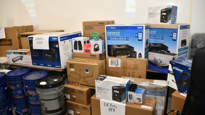 El material incluye computadoras, pantallas digitales, proyectores portátiles, discos duros, audífonos, bocinas, impresoras, multifuncionales, señalización, sillones, sillas, mesas, escritorios, lámparas exteriores, focos, pintura, impermeabilizante, dispensadores de agua, entre otros materiales.