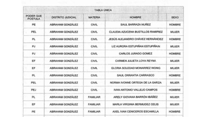 El Instituto Estatal Electoral (IEE) de Chihuahua publicó la lista de los candidatos a jueces locales y a magistrados tanto del Tribunal Superior de Justicia (TSJ) como del Tribunal de Disciplina Judicial (TDJ) del Estado de Chihuahua a elegir en las urnas el 1 de junio. Aquí se dan a conocer las listas de todos los aspirantes, incluidos los que buscan un cargo en el Distrito Judicial Abraham González con cabecera en Delicias.