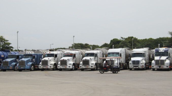 Vehículos que transportan combustible permanecen estacionados este lunes, en Tapachula (México). EFE/ Juan Manuel Blanco