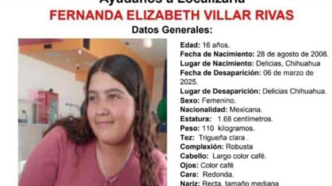 La familia de Fernanda Elizabeth Villar Rivas, una joven de 16 años, está desesperada y pide el apoyo de la comunidad para dar con su paradero, pues desapareció desde el día de ayer en la ciudad de Delicias y, desde entonces, no se tienen noticias sobre ella.