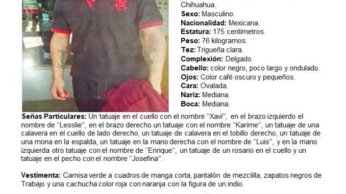 Como señas particulares, porta varios tatuajes: En el cuello el nombre “Javi” y un rosario, en el brazo izquierdo el nombre “Leslie”, en el derecho “Karime”, una calavera en el cuello lado derecho, otra calavera en el tobillo derecho, una mona en la espalda, el nombre “Luis” en la mano derecha, “Enrique” en la mano izquierda y “Josefina” en el pecho.