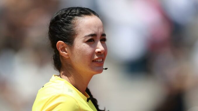 MEX9324. CIUDAD DE MÉXICO (MÉXICO), 12/04/2026.- La árbitro central Katia Itzel García reacciona este domingo, en un partido de la Liga MX entre Pumas y Mazatlán en el estadio Olímpico Universitario en Ciudad de México (México). EFE/ Alex Cruz