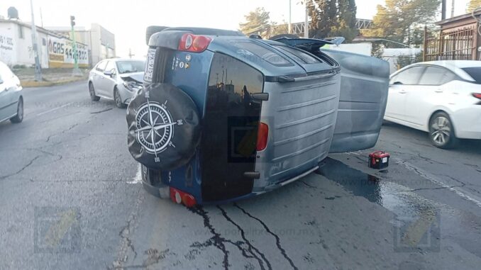 El percance ocurrió cuando la conductora de una camioneta Jeep Liberty intentó incorporarse a la vialidad principal sin percatarse de que, en sentido de sur a norte, avanzaba un automóvil Toyota Corolla, lo que derivó en un impacto directo contra el costado izquierdo del sedán. La fuerza del choque fue tal que la camioneta terminó volcada sobre su costado derecho, generando momentos de alarma entre testigos y automovilistas que transitaban por la zona.