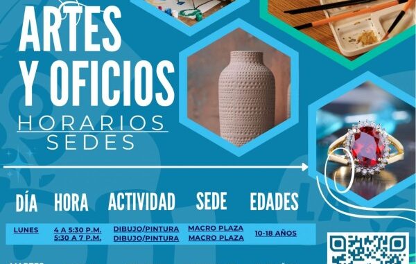 En el área de Artes y Oficios se ofrecen talleres de dibujo y pintura, joyería y cerámica, dirigidos a niñas, niños y adolescentes de entre 10 y 18 años, con horarios vespertinos de lunes a jueves. Las actividades se desarrollan en sedes como Macro Plaza y el CONALEP, con el fin de ampliar el acceso a espacios de formación artística y creativa.