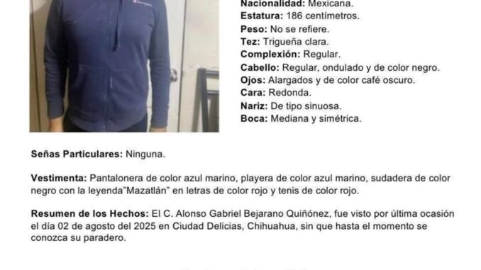 La Comisión Local de Búsqueda emitió una pesquisa para localizar a Alonso Gabriel Bejarano Quiñónez, de 18 años de edad, quien fue visto por última vez el pasado 2 de agosto de 2025 en Ciudad Delicias, Chihuahua, sin que hasta el momento se tenga conocimiento de su paradero, mientras que, la información oficial detalla que el joven vestía pantalonera y playera azul marino, sudadera negra con la leyenda «Mazatlán» en letras rojas, así como tenis del mismo color.