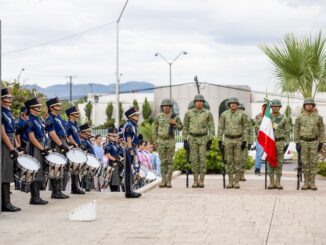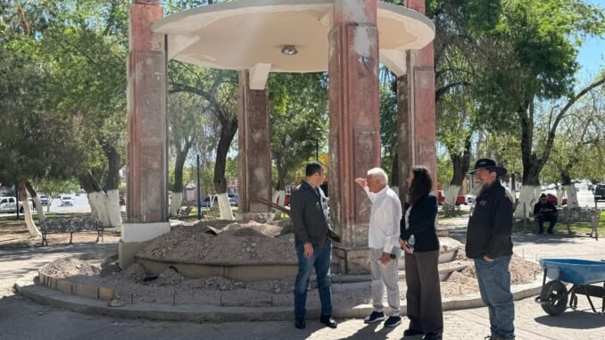 Acompañado por la síndica Gaby Franco, el alcalde Jesús Valenciano estuvo en la Plaza Principal revisando el avance de la remodelación de su histórico kiosko.