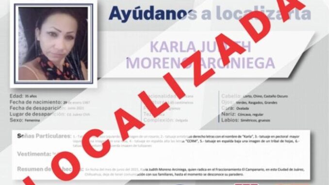 La Fiscalía Especializada en Atención a Mujeres Víctimas del Delito por Razones de Género y a la Familia (FEM), localizó sana y salva a una mujer de iniciales K. J. M. A., quien contaba con reporte de ausencia interpuesto en junio del año 2021, en Ciudad Juárez