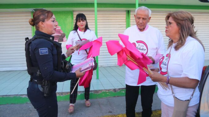 Ciudad Juárez.- En el marco de las actividades conmemorativas del mes de octubre, dedicado a la lucha contra el cáncer y su detección temprana, elementos de la Secretaría de Seguridad Pública Municipal participaron en una jornada de entrega de volantes informativos a la ciudadanía.