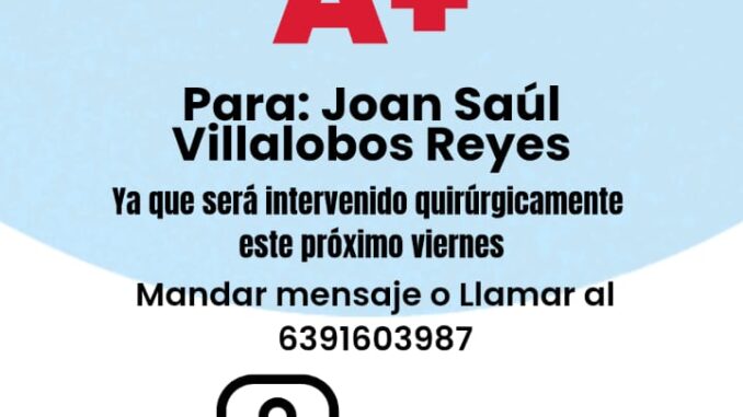 El llamado es urgente, ya que la operación no podrá realizarse hasta contar con las unidades de sangre necesarias, por lo que quienes deseen ayudar pueden acudir mañana a partir de las 7 am al laboratorio del IMSS con identificación oficial y mencionar el nombre del paciente.