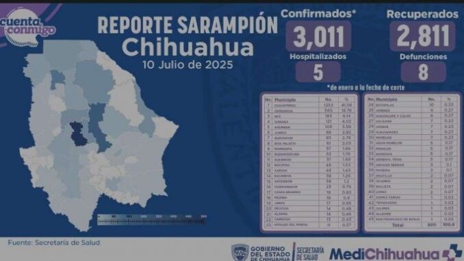 Los casos de sarampión están distribuidos de la siguiente manera: en Cuauhtémoc con mil 253, Chihuahua 565, Nuevo Casas Grandes 185, Ojinaga 121, Ahumada 108, Ciudad Juárez 88, Guachochi 83, Riva Palacio 61, Namiquipa 57, Buenaventura 53, Guerrero 51, Bocoyna 46, Carichí 43, Bachíniva 38, Ascención 36, Cusihuiriachi 23, Casas Grandes 19, Meoqui 18, Janos 17, Aldama 14, Delicias 14, Camargo 13, Parral 11, Batopilas 10, Jiménez 9, Guadalupe y Calvo 8, Galeana 7, Urique 7, Guazapares 7, Morelos 7, Gran Morelos 5, Rosales 5, Nonoava 5, General Trias 5, Aquiles Serdán 3, Madera 3, Saucillo 2, Ocampo 2, Balleza 2, López 2, Gómez Farías 1, Temosachic 1, Julimes 1, Allende 1, San Francisco de Borja 1.