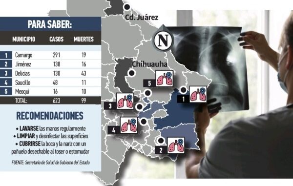 Mientras que en los casos hasta el pasado lunes 24 de noviembre se cuenta con un registro de 7 mil 374 casos confirmados de neumonías y bronconeumonías en la entidad, estos casos se distribuyen de la siguiente manera: 3 mil 355 en Chihuahua, mil 565 en Ciudad Juárez, 369 en Cuauhtémoc, 291 en Camargo.