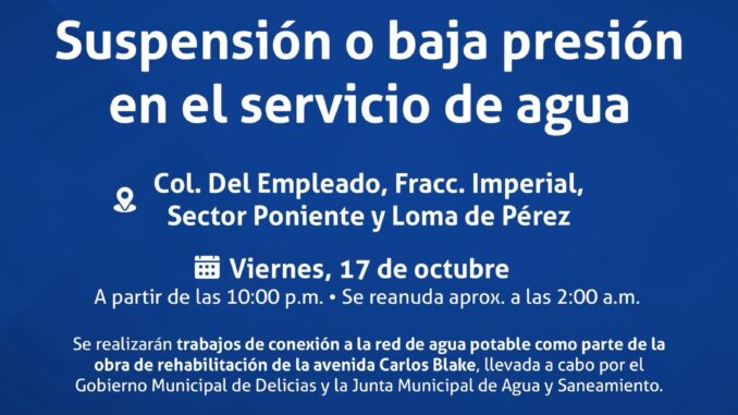 El Gobierno Municipal de Delicias informa que esta noche se realizará una suspensión temporal o baja presión en el servicio de agua potable, afectando principalmente la zona Norte y Poniente de la ciudad. Esto se debe a trabajos de integración de la nueva red de agua potable en la rehabilitación integral de la Avenida Carlos Blake. Detalles de los trabajos: