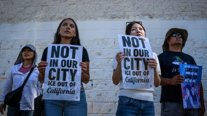 Activistas y trabajadores de origen latino y asiático exigen un alto a las redadas de agentes del ICE, así como la liberación de algunos trabajadores que fueron encarcelados en Los Ángeles. Foto de EFE/ David Toro