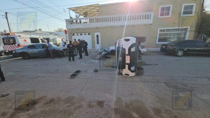 Chihuahua.- Un fuerte choque se registró en la intersección de las calles Pino y Velázquez de León, luego de que una camioneta blindada perteneciente a la empresa de transporte de valores Tecnoval volcara tras ser impactada por otro automóvil. El percance se originó cuando el chofer de la unidad blindada, que transitaba por Velázquez de León en dirección de norte a sur, no respetó el señalamiento de alto obligatorio.